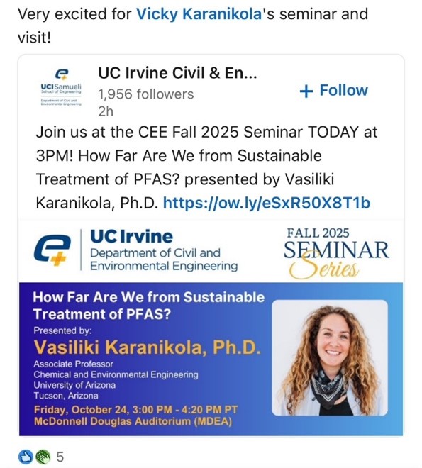 Fun at University of California-Irvine! This week Vicky gave an invited seminar at the UC-I Civil and Environmental Engineering department on the KORES group journey of PFAS remediation. Had a blast visit with Dr Chris Olivares!